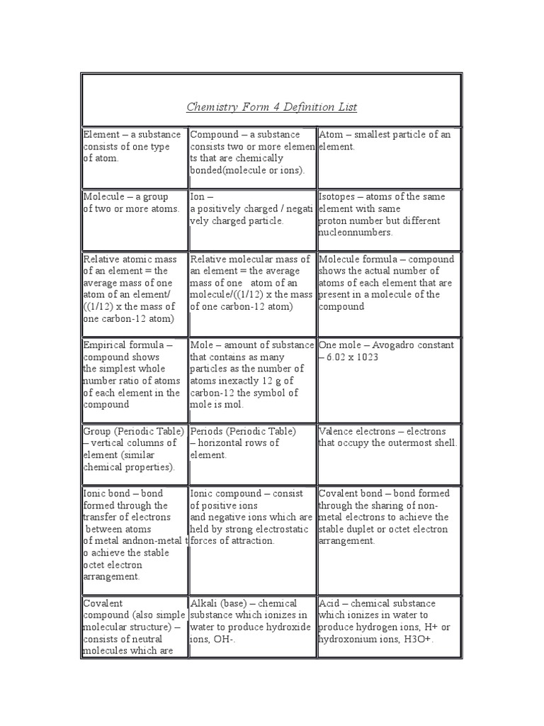 Chemistry Form 4 Definition List Pdf Molecules Atoms